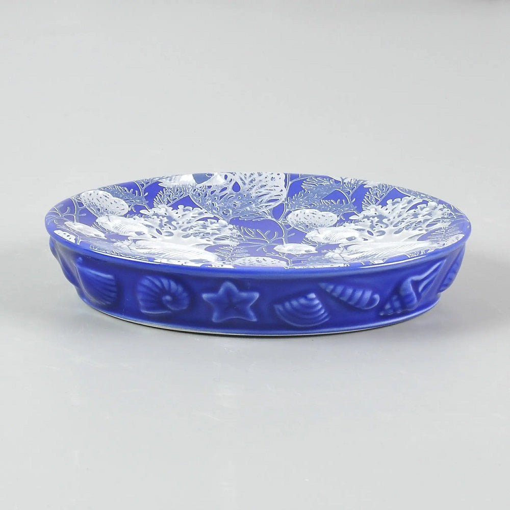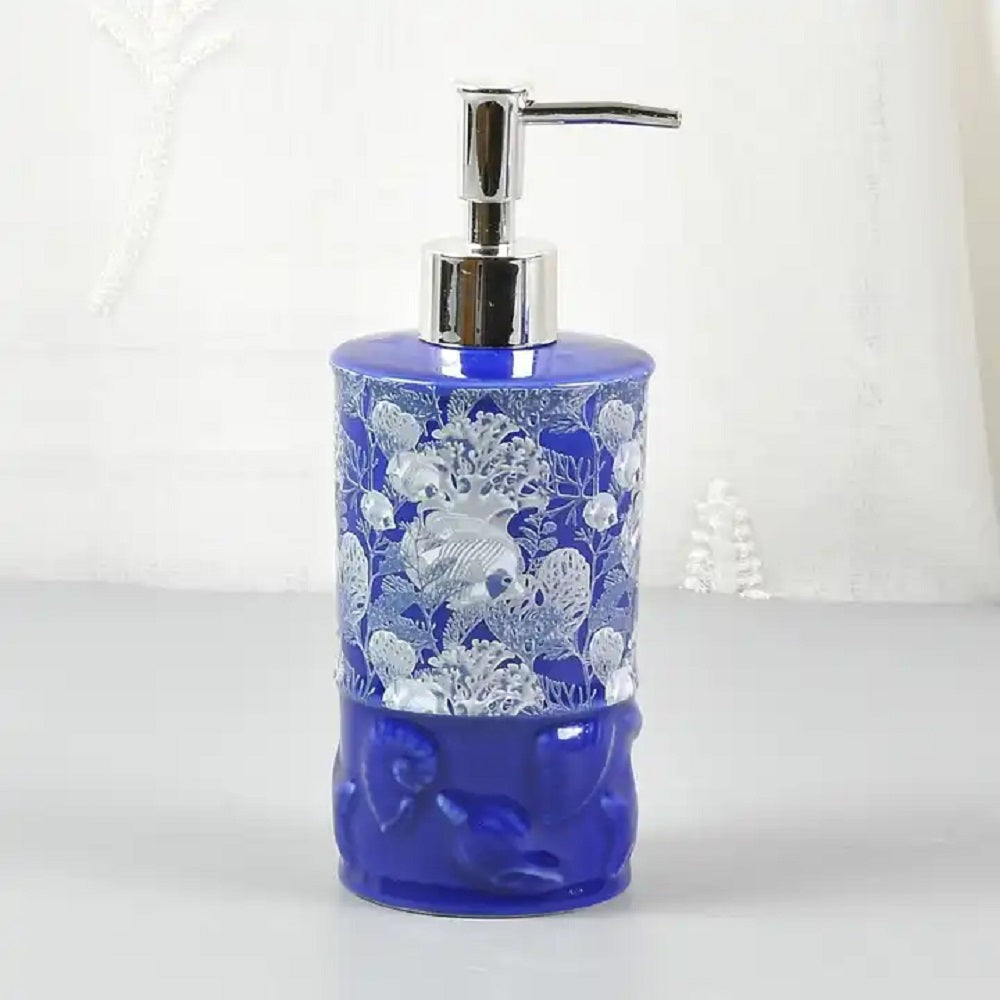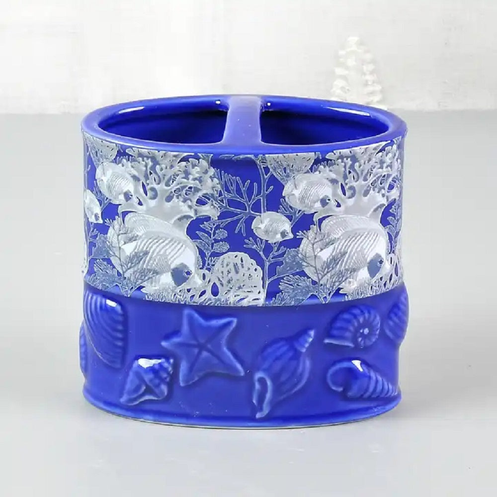 | 4-piece Blue Seashell Emboss Ceramic Sea World Decal Bathroom Accessory Set, which includes rinse cup, soap dish, lotion dispenser and toothbrush/toothpaste holder. |